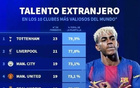 身價前10俱樂部外援人數(shù)占比:熱刺79.3%最高,巴薩43.5%最低
